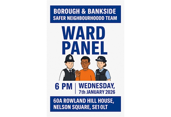I’d like to remind you that the Borough & Bankside Safer Neighbourhoods Team will be hosting a Ward Panel Meeting on Wednesday, 7th January 2026. Please note that there is no meeting scheduled by our team on 24th November 2025, even though this appear on the Borough & Bankside SNT Met Engage page.