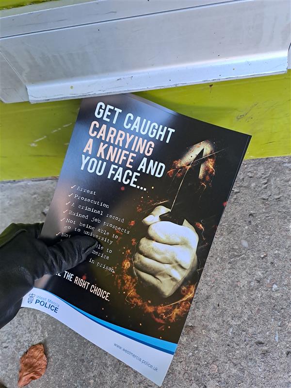 PCSO Karen Watson, Priory & Malvern Wells Safer Neighbourhood Team, has been on foot patrol distributing leaflets. Get Caught Carrying a Knife and You Face: Arrest, prosecution, criminal record, ruined job prospects, not being able to go to university, not being able to travel to America, four years in prison. Distributed to Licensed premises, Gt Malvern Town, Priory & Malvern Wells. MAKE THE RIGHT CHOICE #OpSceptre | ||