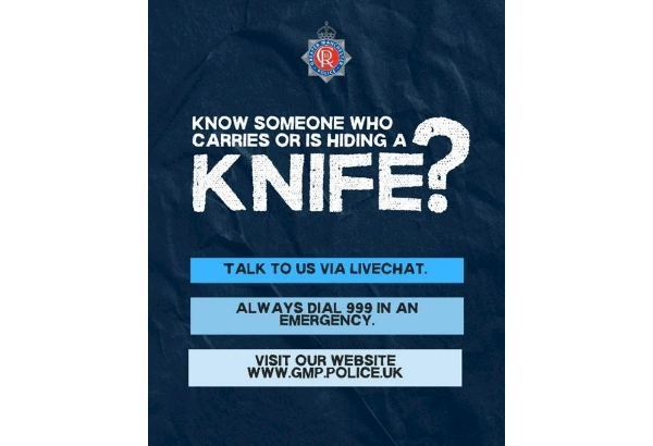 If you have concerns about someone you know who is carrying or hiding a knife, or if you are aware that knives are being concealed in your community, talk to us via LiveChat: www.gmp.police.uk Dial 999 in an emergency.
