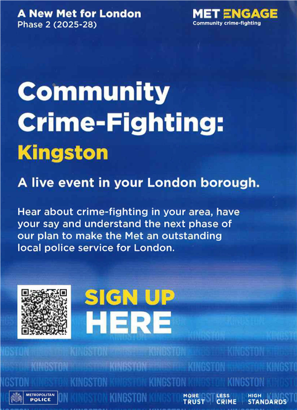 This three-hour event will bring together residents, business owners, partners, and stakeholders from across the borough to discuss Kingston’s local policing priorities and the progress we have made in response to community concerns. The Deputy Commissioner, alongside our Superintendent and borough Inspectors, will present the latest crime data, highlight successful initiatives, and outline how we are continuing to deliver the Met’s plan for a safer Kingston.