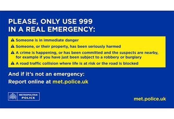You should call 999 only for emergencies, such as when there is immediate danger, a crime is in progress, or life is at risk. For all other non-emergency situations, call 101 or report a crime online at www.met.police.uk/ro/report/. Emergency (call 999) There is immediate danger to life or property. A crime is happening right now (e.g., a burglary or theft). Someone is injured or in immediate danger. Non-emergency (call 101 or go online) Call 101: For non-emergency enquiries, or to report non-urgent crimes like a stolen car or property damage. Report online: Use the online service at www.met.police.uk/ro/report/ to report crimes or get updates on a report. Other online services: You can also use the website for other matters, such as submitting a request for information, or reporting lost property. | ||