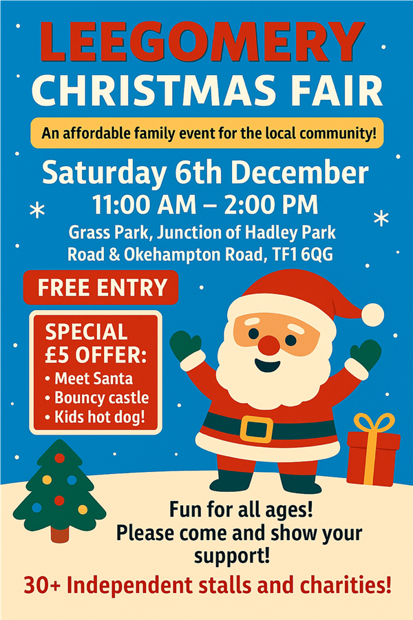 Leegomery Christmas Fair Saturday 6th Dec 2025 11:00-14:00 |