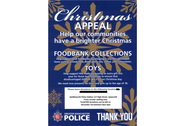 On the 3rd December 2025 between 9am-3pm, Saddleworth Police Station front desk will be open for residents to drop of any:- This has been very successful in previous years thanks to the generosity of the Saddleworth community. We look forwards to seeing you. Regards Saddleworth Neighbourhood Policing Team