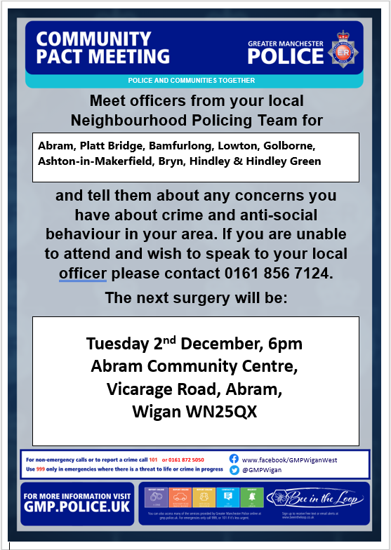 Everyone is welcome and it would be great to see you there. Welcoming members of the community from Abram, Platt Bridge, Bamfurlong, Lowton, Golborne, Ashton-in-Makerfield, Bryn, Hindley & Hindley Green to discuss community issues with the local policing teams, Wigan Council, Councillors and Partner Agencies. The meeting will serve to update you on priority activities within your areas, listen to your concerns and share our progress as a force.