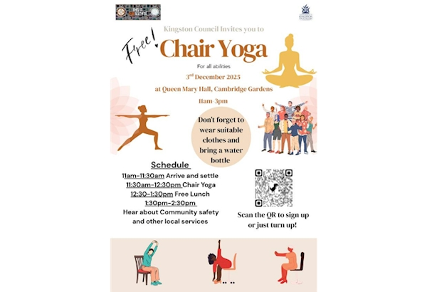 RBK Community Safety Team are holding a Free Event, Join us at the Chair Yoga on 3rd December 2025 between 11am-3pm at Queen Mary Hall, Cambridge Gardens.