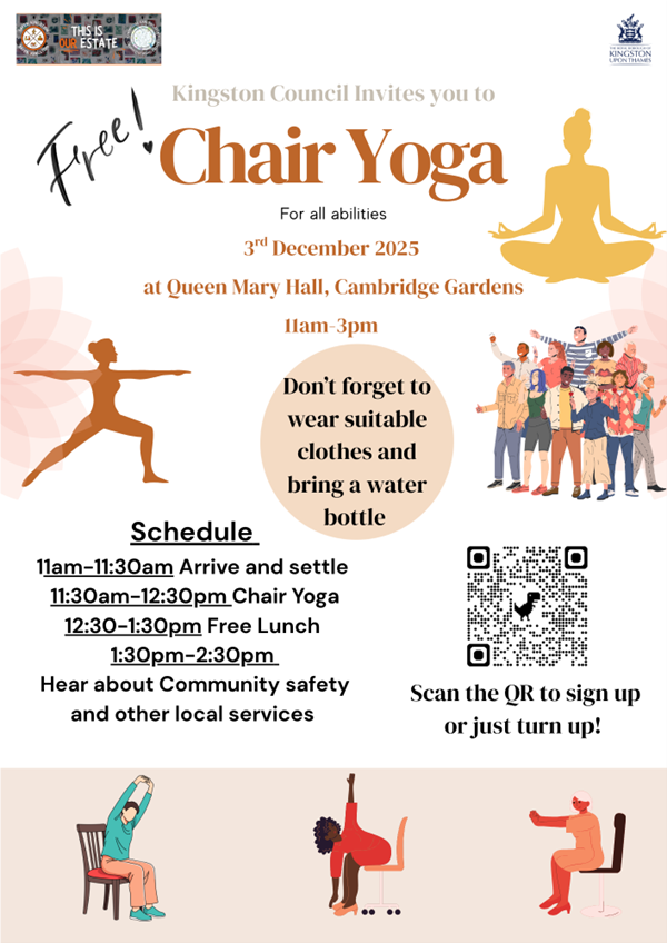 Kingston Council - The Community Safety team is holding Chair Yoga event on 3rd December 2025 between 11am-3pm at Queen Mary Hall, Cambridge Gardens. The event will focus on Chair Yoga for all abilities followed by a group lunch. Then the focus will be on community safety, hate crime and information on local service providers.