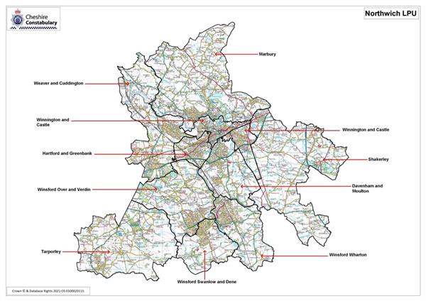 The map shows how Northwich Local Policing Unit is broken down into community areas covering a number of towns in the area. If you go to the Your Area section of this site and put your postcode in you'll be able to find out which area you live in : - Your area | Cheshire Constabulary