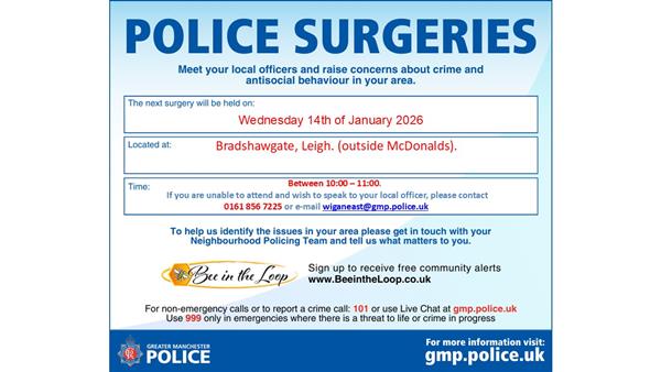 Dear Resident, Leigh Neighbourhood Policing Team Announces Regular Town Centre Police SurgeriesStarting next month, the Leigh Neighbourhood Policing Team will hold regular Police Surgeries in Leigh Town Centre, providing residents with an opportunity to meet officers, raise concerns, and discuss local issues. To make these sessions accessible to everyone, surgeries will be held on both weekdays and weekends. Below is the schedule for upcoming dates: These surgeries are part of GMP’s commitment to working closely with the community and ensuring residents have a direct line of communication with their local policing team. |