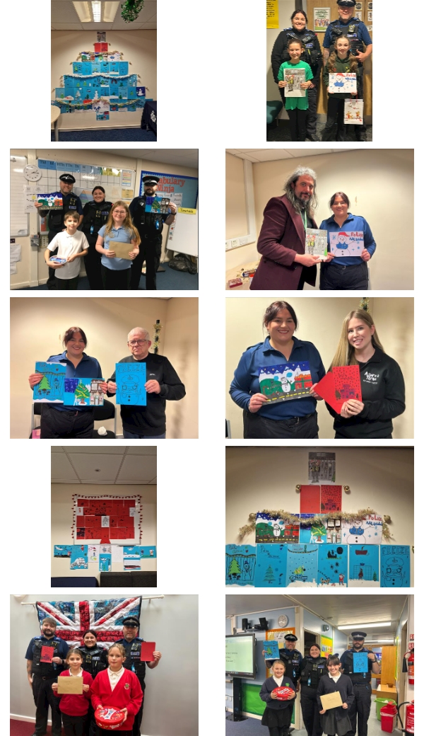 This month, PCSO Smith from Coleshill Safer Neighbourhood Team organised a Christmas drawing competition with the primary schools on her patch. All of the drawings were of the Police at Christmas and they were all fantastic! Thank you to Wood End Primary, Hurley Primary, Kingsbury Primary and Water Orton Primary for getting involved. Thank you to Cllr Steve Stuart, Cllr Ray Jarvis and Libby from Aspire and Thrive for helping judge the drawings and well done to the winners! Thank you to Cliff Lakes, The Belfry, Red Kangaroo, Planters Tamworth and Cllr Ray Jarvis for donating gifts for the winners. Officers from Atherstone and Coleshill SNT have made the drawings into a Christmas Tree for Coleshill Police Station. It's beginning to look a lot like Christmas.... 6360