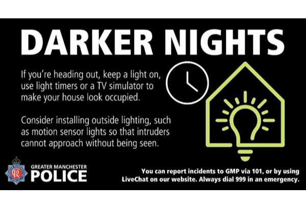 After a recent rise in burglaries in the area , please see the following information. #DarkerNights | Light timers are a great way to make burglars think your home is occupied. Time them to come on and off intermittently as it goes dark to give the impression somebody is at home. Read more advice here: https://www.gmp.police.uk/cp/crime-prevention/protect-home-crime/