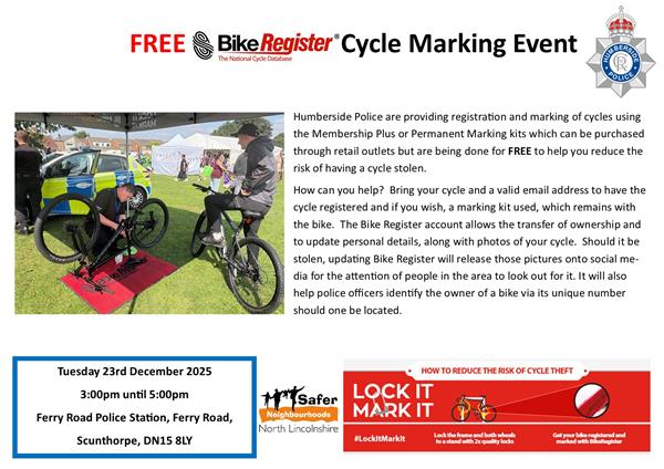 The Crosby and Park Neighbourhood team will be offering free cycle marking and registration at Ferry Road Police Station on 23rd December. Come along between 15:00 and 17:00. A valid email address is required to complete registration.