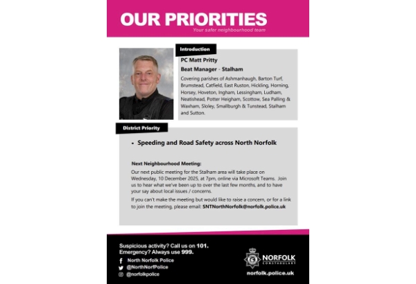 Dear all, Please join us for our upcoming Neighbourhood Meeting for the Stalham area taking place on: π Wednesday, 10 December 2025 π 7:00 PM π Online via MS Teams (link: Join the meeting now) The Stalham Neighbourhood Meeting covers the parishes of Ashmanhaugh, Barton Turf, Horning, Brumstead, Catfield, East Ruston, Hickling, Horsey, Hoveton, Ingham, Lessingham, Ludham, Neatishead, Potter Heigham, Sea Palling & Waxham, Scottow, Sloley, Smallburgh, Stalham, Sutton, and Tunstead. Come along to hear updates on our recent work and share your thoughts on local issues and concerns. If you're unable to attend but would like to raise a matter, please email your local Beat Managers at SNTNorthNorfolk@norfolk.police.uk. If you can help spread the word by displaying the poster on a noticeboard, sharing it on social media, or including it in a newsletter, weβd be very grateful. If you have any questions, feel free to contact us at the above email, or reach out to me directly. Kind regards Pete