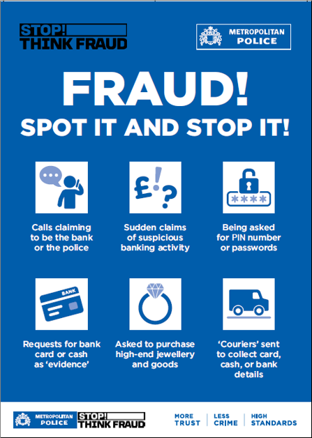 I wanted to provide you with an update regarding Fraud, which people around your area have highlighted as an issue of concern on the priority survey. Fraudsters are posing as bank officials or police officers over the phone, asking you to withdraw cash or buy goods to 'protect' your money, then sending a “courier” to collect them. Fraud can affect anyone within the community, so we want to make sure you have the tools and knowledge to protect yourself from it. It comes in many different forms and across varying channels, whether that's through emails, phone calls or in person encounters. Some adults may be even more vulnerable to fraud or financial abuse, but it is something that everyone can be at risk of. If you’re concerned about someone you know, please contact your local social services and ask for Adult Social Care.