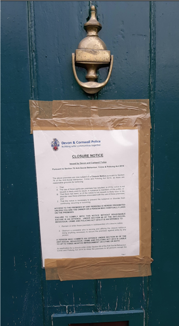 Following an escalation process, on 17th November 2025 Devon & Cornwall Police with the aid of our ASB Lawyer successfully applied for a Partial Closure Order at the address. This order has been granted by a Magistrate following the evidence gained from our partnership working, working with the residents and local community. This order lasts for 3 months and means that only certain persons named on the order can have access to the property, any other visitors will be committing a criminal offence by entering the premises.
