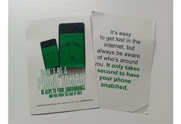 On Wednesday this week in Rainham Road South, 4 homeward school children and 2 adults using their phones were presented with a simple handout reminding them to be vigilant.