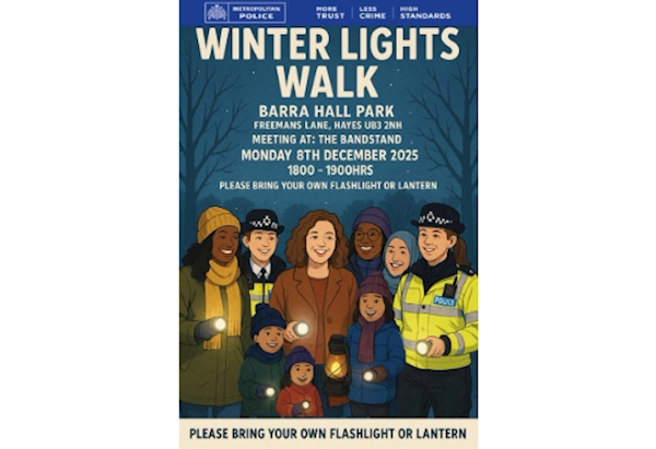 The Hayes Neighbourhood Policing Team are conducting a “Winter Lights Walk” at Barra Hall Park on Monday 8th December 2025, between 1800-1900hrs. This is to highlight the concern that people, particularly women, feel walking in spaces when it is dark. This is tailored to our efforts to improve how we listen to those impacted by Violence against Women and Girls (VAWG). We are looking to promote this to Women and their families, to join us on this community event. We ask people to bring a flashlight or lantern.
