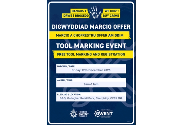 Your local Safer Neighbourhood Team will be working with the We Don't Buy Crime department within Gwent Police conducting a Tool Marking Event at B & Q, Caerphilly on Friday 12th December 2025 at 9am-11am.