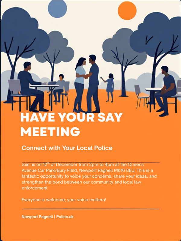 Dear all , Your local Neighbourhood Team will be hosting a Have Your Say event at Queens Avenue Car Park/Bury Field, Newport Pagnell (MK16 8EU) on Friday, 12 December, from 2:00pm to 4:00pm. This is an opportunity to share any concerns you may have and to learn more about the steps we are taking to address the issues that matter most to our community. We appreciate that this notice comes at short notice, but we very much hope you will be able to join us. Everyone is welcome, and we would be delighted to see you there! For more information please refer to (Newport Pagnell | Police.uk)