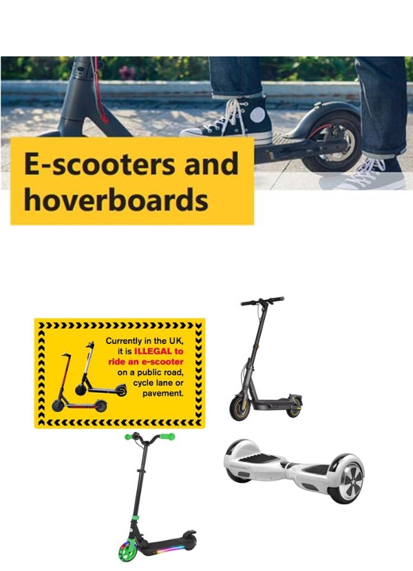 Electric scooters. Although e-scooters are available to buy they are currently illegal to use on public roads, pavements, cycle lanes and pedestrian-only areas. E-scooters are currently classed as Personal Light Electric Vehicles (PLEVs) by the Government and fall under the same laws and regulations that apply to all motor vehicles in terms of requiring insurance, tax, MOT, licence and registration. There is no mechanism in place at the moment to obtain any of these for e-scooters so as this requirement can’t be met their use in public areas is illegal. Anyone found using them in public areas risks having the e-scooter seized by the police and face the possibility to being fined and even issued points. More information can be found at Riding an electric scooter: the rules - GOV.UK