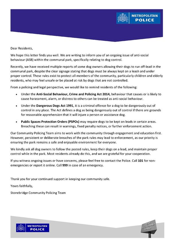 I wanted to provide an update regarding Dangerous dogs, which people around this area have highlighted as an issue of concern on the priority survey. Following reports of ongoing issues in the communal park, Stonebridge Community Policing Team delivered letters to residents reminding dog owners that dogs must be kept on a lead and under control at all times. It’s an offence to let a dog be dangerously out of control whether that’s in public or private.