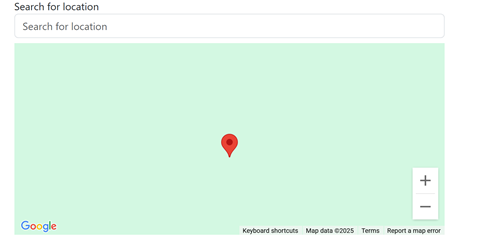 Then you can use the location search to look up a location. When you have selected a location, the map will update to reflect this. You can also drag the red pin on the map to further adjust the selected location.