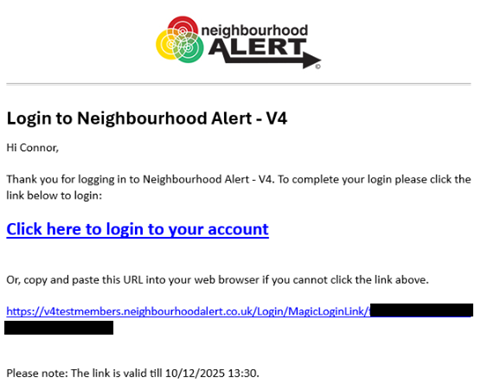 To login to your account, input your email address into the box as above. The system will then send you a One-time login link by email, from the email address alert@neighbourhoodalert.co.uk.