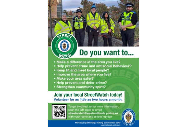 Ready to take an active role in keeping our community safe? To get involved, or for more information email: streetwatch@westmidlands.police.uk