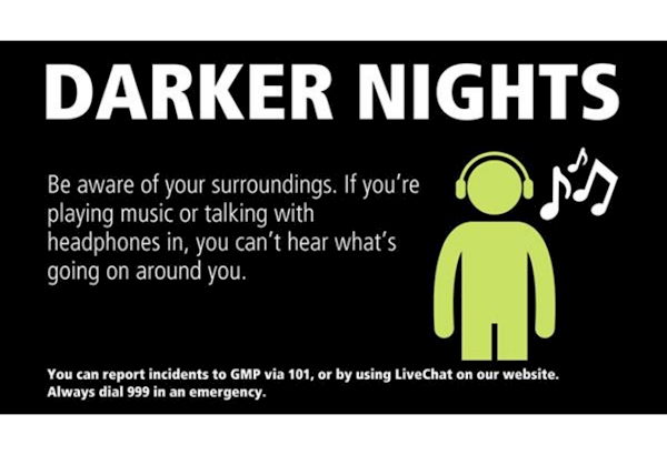 DARKER NIGHTS Be aware of your surroundings. If you’re You can report incidents to GMP via 101, or by using LiveChat on our website.
