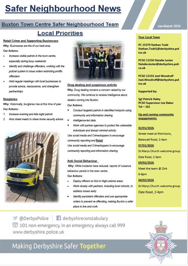 The local SNT has set the priorities for the next three months for Buxton town centre and Harper Hill: Retail Crime and Supporting Businesses Why: Businesses are in the centre of our beat area: Our Actions: Burglaries Why: Historically, burglaries rise at this time of year: Our Actions: Drug dealing and suspicious activity Why: Drug dealing remains a concern raised by our community. We continue to receive intelligence about dealers coming into Buxton: Our Actions: Use social media and Crimestoppers to encourage community reporting and Retail Use social media and Crimestoppers to encourage community reporting and information sharing.