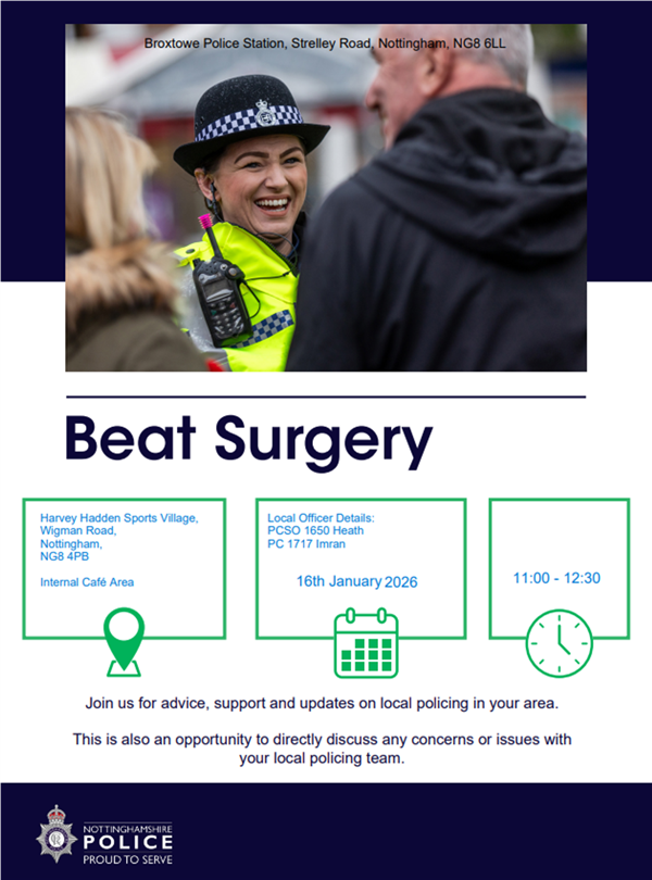 This is to let you know that your local Safer Neighbourhood Team will be at event shown in your area. Please take this opportunity to come and meet us to raise any concerns you may have and to find out what we are doing to tackle the issues that matter to you.