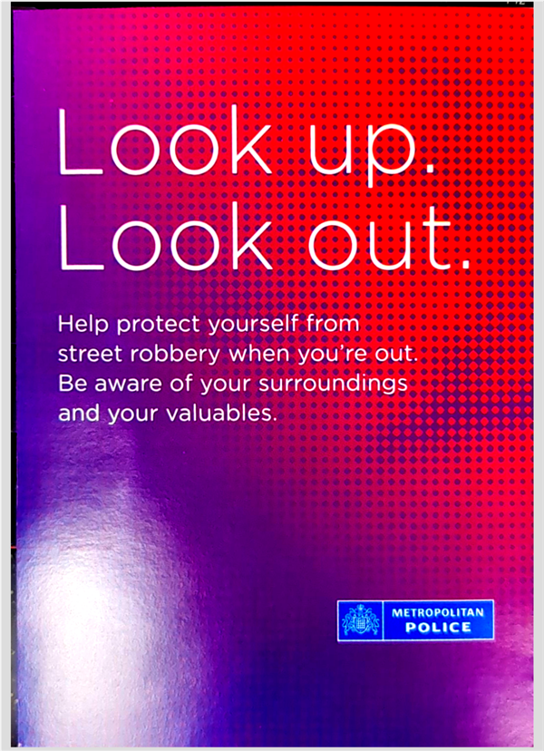 I wanted to provide you an update regarding robbery, which some members around this area have highlighted as an issue of concern on the Met Engage priority survey. LOOK UP. LOOK OUT. Stay Safe This Winter