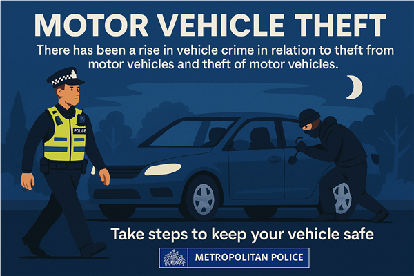 I wanted to provide an update regarding the theft of motor vehicles, which members around this area have highlighted as an issue of concern on the Met Engage priority survey. There has been a recent rise in vehicle crime in relation to theft from motor vehicle and theft of motor vehicles. More visible patrols are ongoing in your local area. We know that people can be concerned about the personal and financial impact of having their vehicle stolen, which is why we will pursue and arrest those who break the law. Please consider taking the following steps to keep your vehicle safe: