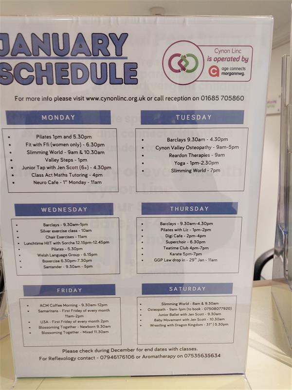 Please find attached a copy of January`s Schedule at Cynon Link, Aberdare for anyone that needs to use their facilities.