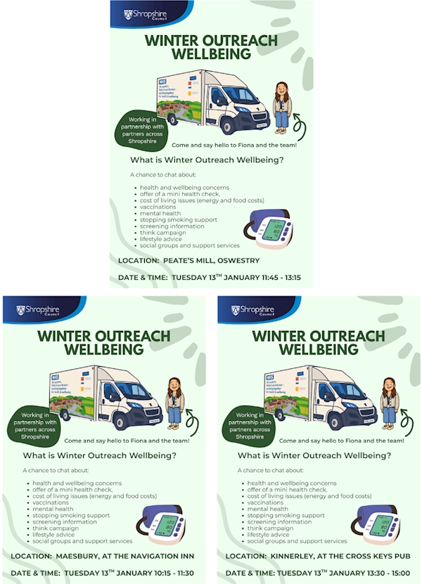 Once again the Shropshire Council Wellbeing Van will be visiting our area. They will be with us on January 13th and will be at - Maesbury - parking at the Navigation Inn 10.15 - 11.30 Peate's Mill - at the Boatyard 11.45 - 13.15 Kinnerley - parking at the Cross Keys Pub 13.30 - 16.00