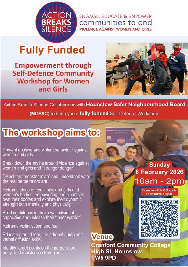 The Met is working in cooperation with Action Breaks silence, the Safer Neighbourhood Board and Hounslow Council to deliver a Self Defence Workshop to prevent Violence and abuse towards Women and girls In Cranford Community College.