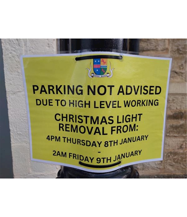 Residents, Can shop & residents ensure ALL vehicles are removed from the Town Centre parking bays by ; 4pm THUR 8 JAN This will allow easier access for the contractors to take down the excellent Christmas Lights that your council arranged for the residents over the Festive season. Regards PCSO TIM BUTTER