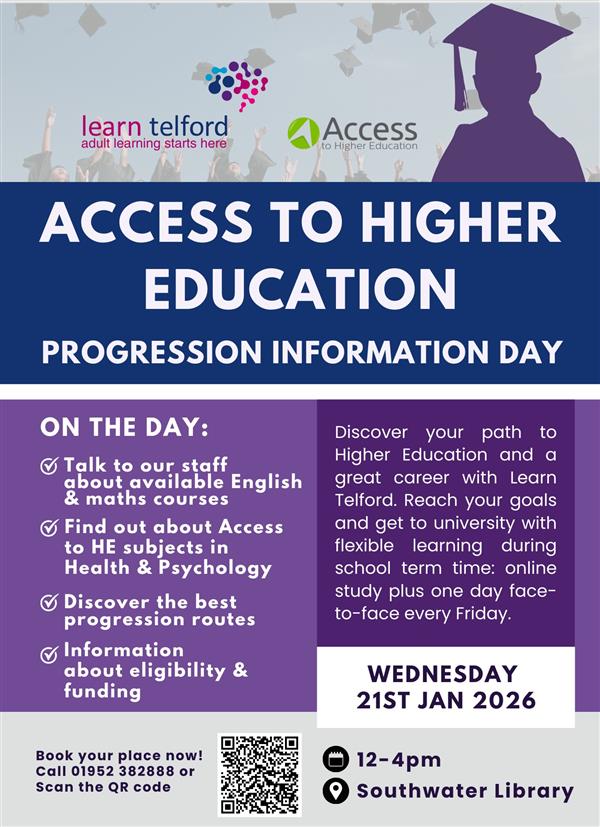 Dear resident Please find attached poster for our Learn Telford Access to Higher Education Open Day, at Southwater Library on 21st January. Anyone interested can register by scanning the QR code or call 01952 382888.