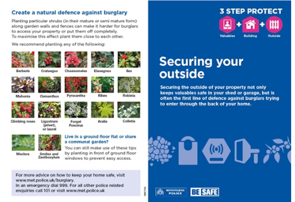 Please note the below recommended plants to help prevent burglars climbing over fences or gates, to stop them gaining entry to your property. Some of these can also be placed by ground floor windows to prevent easy access.