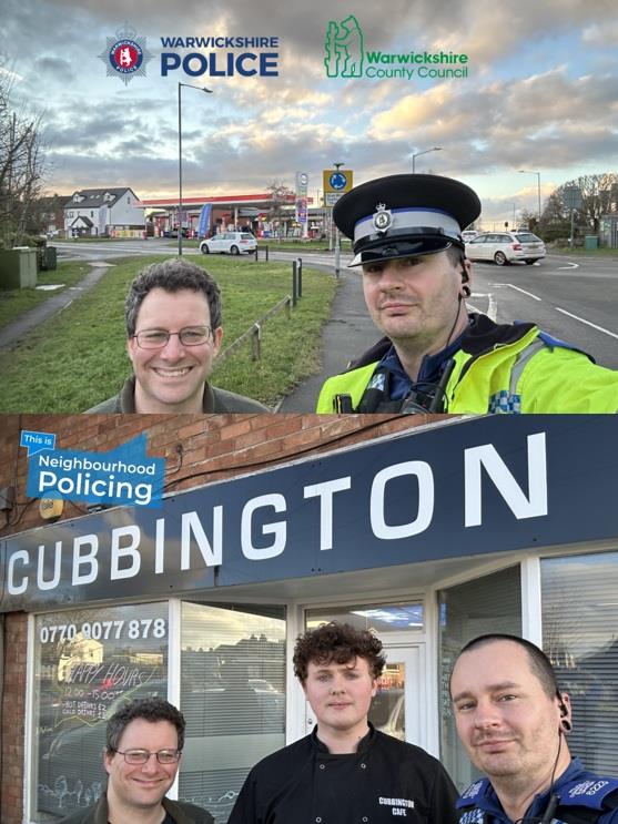 Dear Resident, This afternoon, PCSO Ed King held a Cuppa with a Copper event at Cubbington Cafe. These events provide the opportunity for persons in the local community to discuss local issues/concerns face-to-face with a member of their local SNT, and to find out about crime prevention. Ed was joined by Warwickshire County Council Councillor Ben Edwards. A big thanks to James and Chris at Cubbington Café for providing the venue. After the event at Cubbington Café, PCSO King and Cllr Edwards conducted a ward walk around Cubbington village. Local issues were discussed, along with visiting areas of concern. We stopped on route a number of times to engage with residents and community representatives. We're working together to address your concerns. Warwick Rural East Safer Neighbourhood Team will continue to conduct ward walks with your local WRE community representatives. If you see us out and about, come and tell us what matters to you. #RuralMatters #rurallife #RuralPolicing #SaferStreetsWinter #ThisIsNeighbourhoodPolicing Regards, Warwick Rural East Safer Neighbourhood Team Dial: 01926 684471 | Email: SNTWarwickRuralEast@warwickshire.police.uk Facebook: @kenilworthandwarwickruralpolice | Website: https://www.warwickshire.police.uk | ||