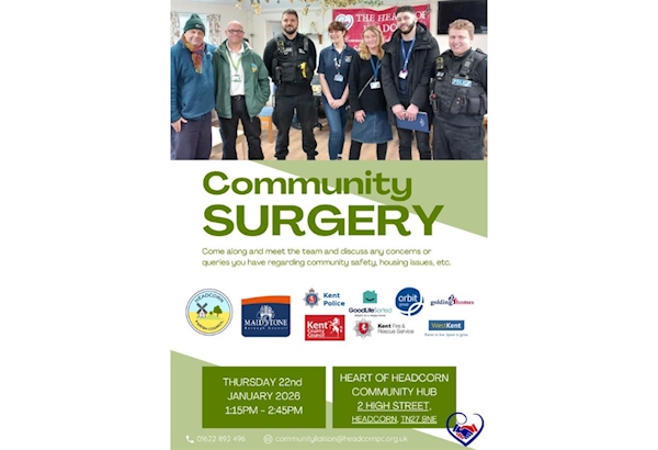 Your local Beat Officers and PCSOs will be attending the Headcorn Community Surgery tomorrow (21/01/2026) at THE HEART OF HEADCORN, 2 HIGH STREET, HEADCORN, TN27 9NE. The surgery will run from 1315hrs to 1445hrs.