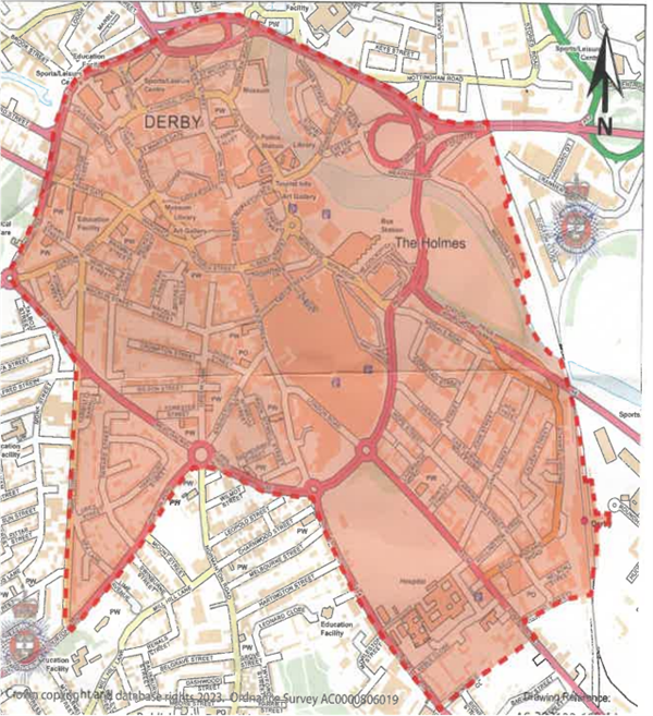 A section 60 order has been imposed to give officers extra stop and search powers in Derby city centre. The order was imposed at 10.15am today (Thursday 22 January) and will remain in place until 7pm today. It will cover the area highlighted in red on the map and has been introduced following increased reports of disorder and to help officers to disrupt violence. The section 60 will give officers additional powers to stop and search individuals and vehicles for offensive weapons or dangerous instruments.