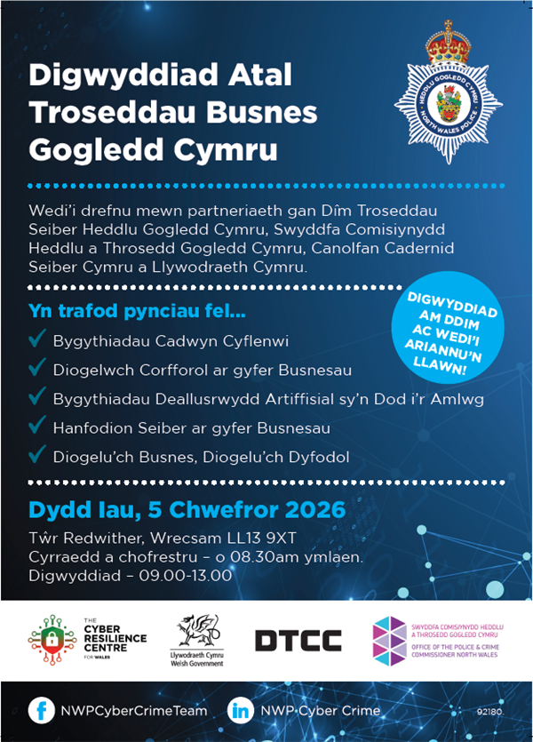 Mae Tîm Troseddau Seiber Heddlu Gogledd Cymru mewn partneriaeth â Swyddfa Comisiynydd Heddlu a Throseddu Gogledd Cymru, Canolfan Seiber-Gydnerthedd Cymru, Llywodraeth Cymru, DTCC ac Uned Troseddau Cyfundrefnol Rhanbarthol y Gogledd Orllewin yn cynnal Digwyddiad Atal Troseddau Busnes rhad ac am ddim ac wedi'i ariannu'n llawn ar y 5ed o Chwefror yn Nhŵr Redwither yn Wrecsam.