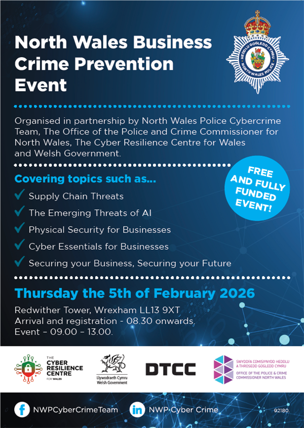 North Wales Police Cybercrime Team in partnership with The Office of the Police and Crime Commissioner for North Wales, The Cyber Resilience Centre for Wales, Welsh Government, DTCC and the North West Regional Organised Crime Unit are hosting a free and fully funded Business Crime Prevention Event on the 5th of February at the Redwither Tower in Wrexham.