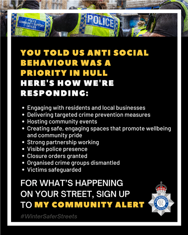 In December alone, 1634 patrols, almost 352 hours walking on the beat and 87 hours driving, covering a distance of 1169 miles, the Hull Neighbourhood Policing teams have been busy tackling crimes including ASB in your area. Find out more about what they’ve been up to. ![]() | ||
