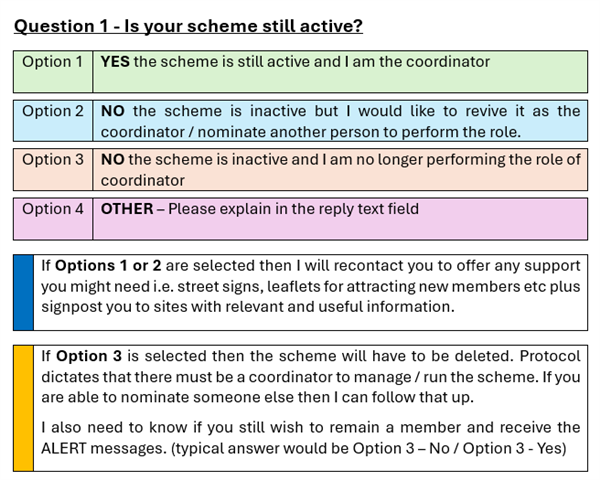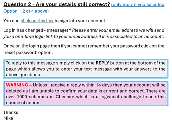 Hi Resident, I am Mike and I am a volunteer with Cheshire Neighbourhood Watch Association (CNWA) assisting with the administration of members and NW schemes. I am currently reviewing NW schemes in the West Cheshire area and as you will appreciate that over the years circumstances / personnel change. It is essential that the data we hold is both current and correct. You are shown as being the coordinator of a scheme – Chester - Mickle Trafford, The Street Neighbourhood Watch Scheme