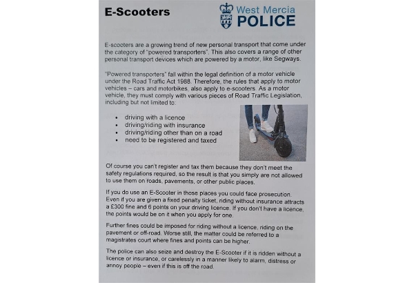 This evening an electric scooter was seized by police on Queens Road, Stourport.