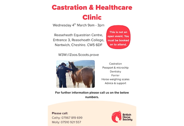 The British Horse Society will be providing a castration and health care clinic at Reaseheath College Wednesday 4th March. For castration the limit is an hours drive from the college. Passport and microchip Farrier Weighing scales Advice and support available from various organisations attending Horse watch will provide record forms and assistance on the day To book please call: Cathy 07967819699 or Molly 07510921557