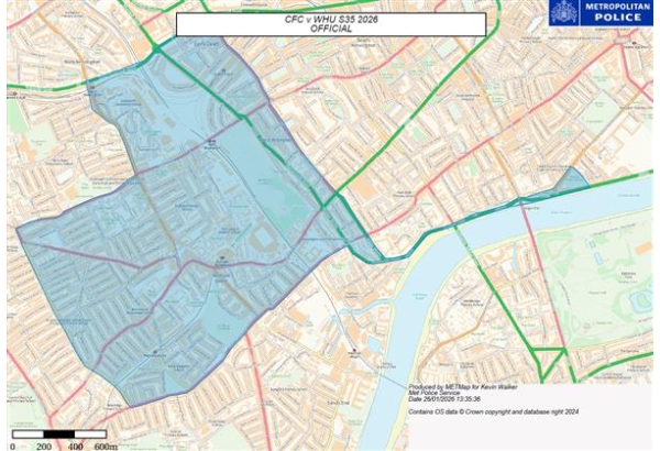 The upcoming football fixture tomorrow between Chelsea FC and West Ham United FC has been assessed as High risk due to intelligence indicating the potential for disorder, anti-social behaviour, and crowd-related issues. To mitigate this, a Section 35 Order has been granted between 1200-2359 hours on the 31st January 2026. The Section 35 dispersal zone will provide officers with the authority to disperse individuals or groups whose presence is likely to contribute to crime, disorder, or anti-social behaviour. The area for the Section 35 is below.