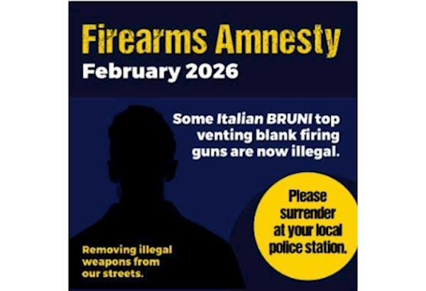 A Firearms Amnesty is being held between 2 to 27 February 2026 for owners of five types of Italian Bruni top-venting blank firers #TVBF which need to be surrendered.