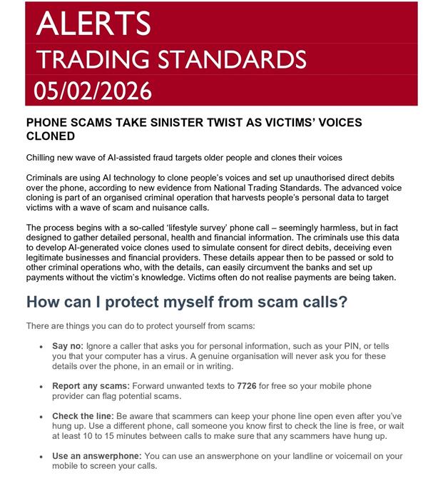 I wanted to provide you with an update regarding Fraud, which people around your area have highlighted as an issue of concern on the priority survey. Please see the below image with information in relation to recent scams from Trading Standards. As the use of AI is becoming more popular phone scams and AI assisted fraud is on the rise. Fraud can affect anyone within the community, so we want to make sure you have the tools and knowledge to protect yourself from it. It comes in many different forms and across varying channels, whether that's through emails, phone calls or in person encounters. Some adults may be even more vulnerable to fraud or financial abuse, but it is something that everyone can be at risk of. If you’re concerned about someone you know, please contact your local social services and ask for Adult Social Care.